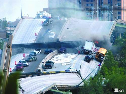 出事的行车大桥已有40年历史,是一条拱桥,总共有8条行车道,用钢和水泥建造,大桥位于密西西河河面对上20米,现时正进行维修工程。早在2001年,受交通部门委托,明尼苏达大学民用工程系曾对这座大桥进行全面评估体检,结果发现大桥路面下方的钢筋结构存在早期疲劳迹象,但当时并没有发现有裂缝存在。有关方面随即认定,这座大桥可继续服役,不需“提前退休”。