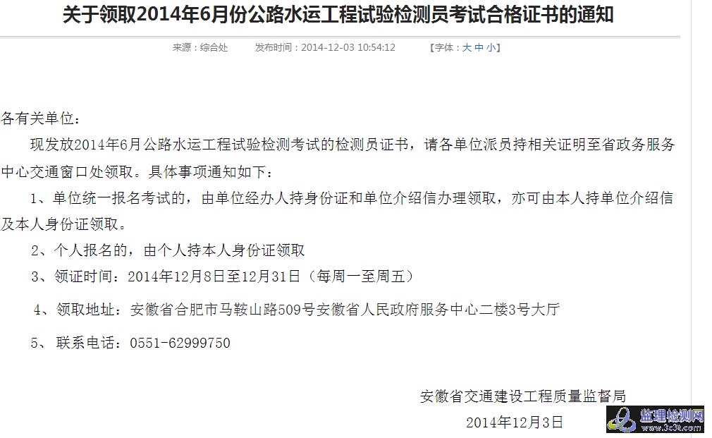 关于领取2014年6月份公路水运工程试验检测员考试合格证书的通知