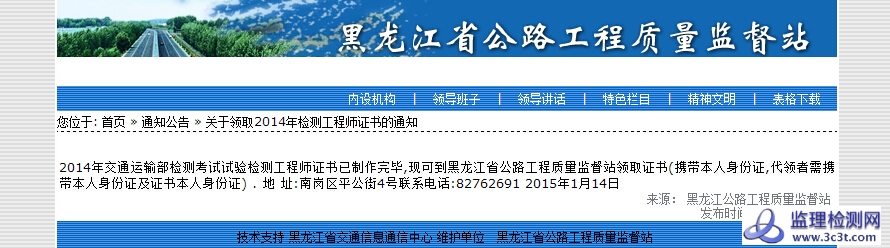 黑龙江检师可以领证了!2014年交通运输部检测考试试验检测工程师证书已制作完毕,现可到黑龙江省公路工程质量监督站领取证书(携带本人身份证,代领者需携带本人身份证及证书本人身份证) 地 址:南岗区平公街4号 联系电话:82762691