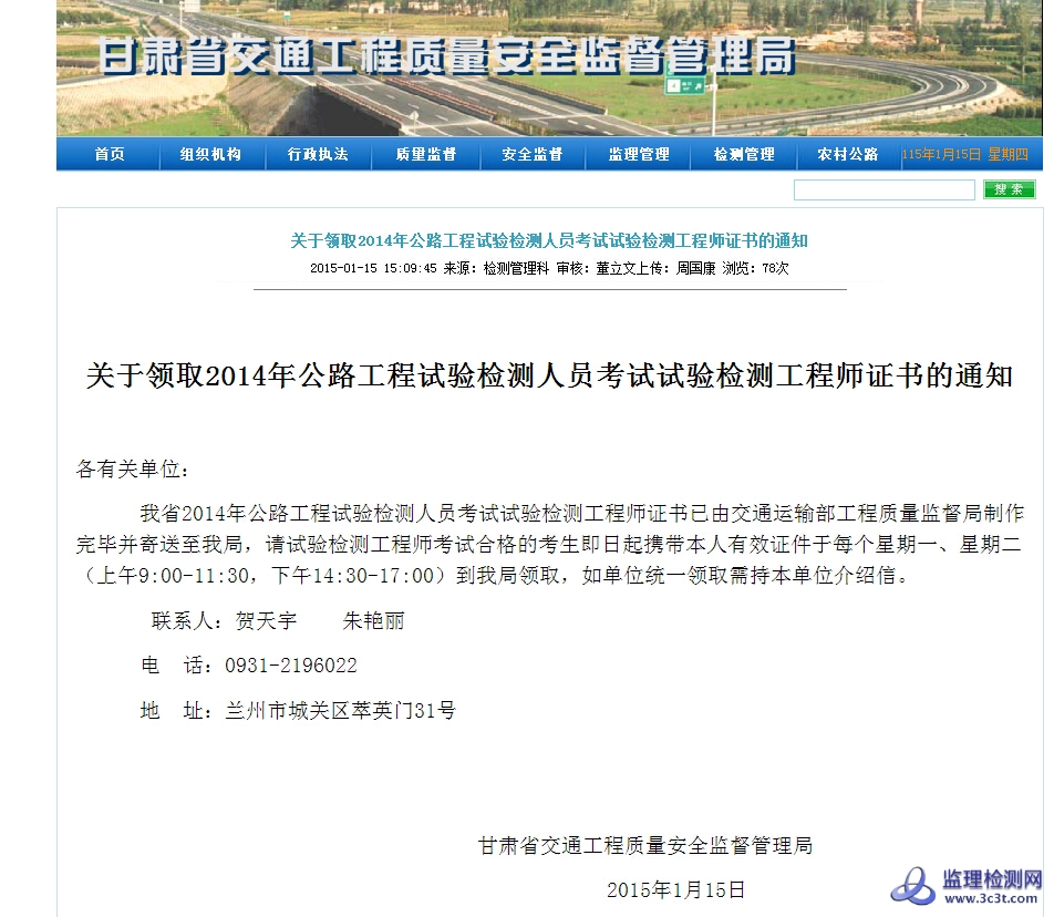 我省2014年公路工程试验检测人员考试试验检测工程师证书已由交通运输部工程质量监督局制作完毕并寄送至我局,请试验检测工程师考试合格的考生即日起携带本人有效证件于每个星期一、星期二(上午9:00-11:30,下午14:30-17:00)到我局领取,如单位统一领取需持本单位介绍信。