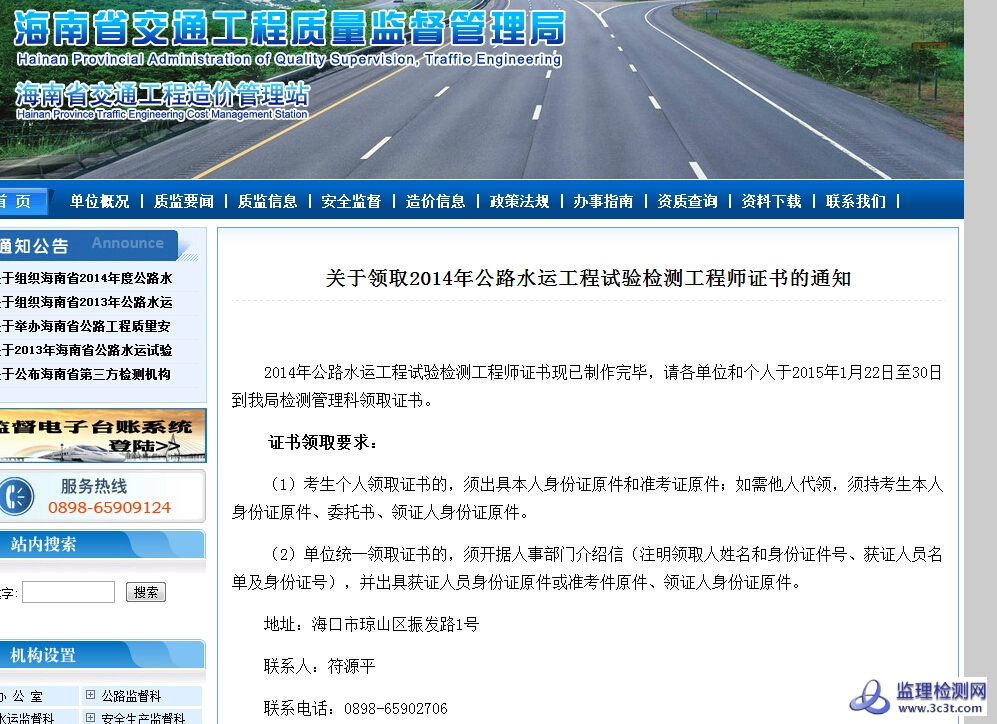 2014年公路水运工程试验检测工程师证书现已制作完毕,请各单位和个人于2015年1月22日至30日到我局检测管理科领取证书。
