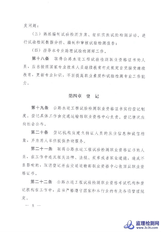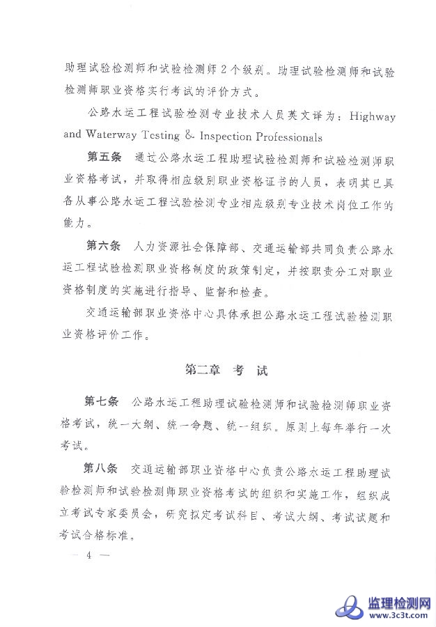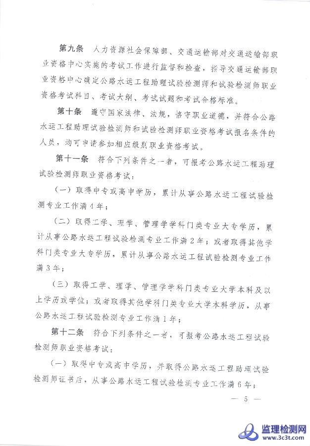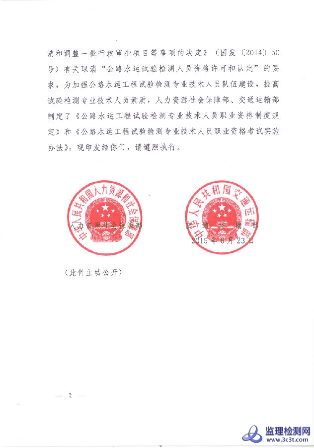 [font=仿宋_GB2312][size=19px][font=Times New Roman]近日,人力资源社会保障部联合交通运输部印发了《关于印发<公路水运工程试验检测专业技术人员职业资格制度规定>和<公路水运工程试验检测专业技术人员职业资格考试实施办法>的通知》(人社部发〔2015〕59号),标志着公路水运工程试验检测专业技术人员国家职业资格制度正式建立,这是交通运输行业建立的第五项国家职业资格制度。该项制度的出台为交通运输基础设施建设和运营安全提供了人才保障和智力支撑,将成为加强安全质量管理的重要抓手。[/font][/size][/font]