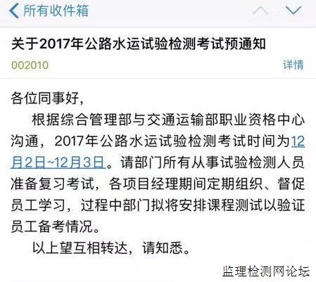交通职业资格网原订2017年公路水运试验检测人员考试时间为11月25-26日,在征求各省意见的基础上,检测考试调整为12月2日至3日。