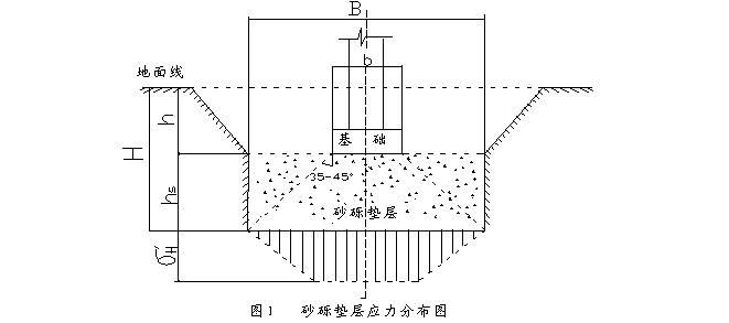 扩散角可假定为为由荷载引起的基础底面的平均压应力(kPa);为原地面至砂砾垫层顶面之间的土层(回填土)容重(kN/m3);为砂砾垫层容重,在地下水位以下应扣除水的浮力(kN/m3);为砂砾垫层的厚度,一般为1~3 m。为基础的长边和宽度(m);为基础底面的埋置深度(m);