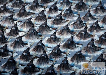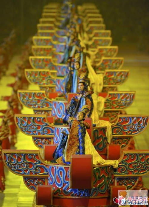 下面是手拿竹制书简的表演。在电视上,导播给这个表演来的也是大特写,特写到满眼都是脑袋上的长羽毛,感觉就是一大群脑袋上带羽毛球的人。我们来看现场的效果.