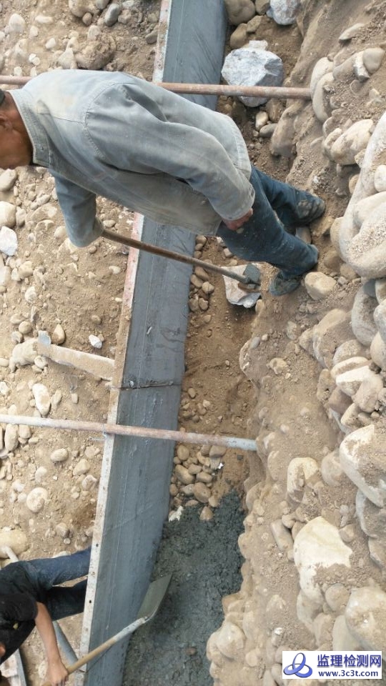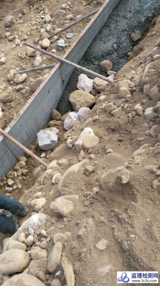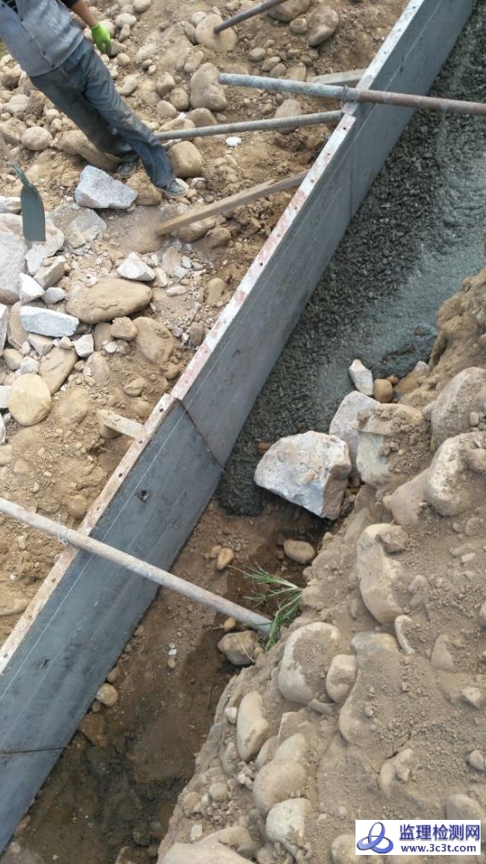 这属野蛮施工,施工员没有尽职尽责,监理更是失职无作为,没有起到监理监督的作用。首先挡墙基坑开挖没有到设计标高,属于偷工减料;基底和边坡没有清理干净有杂物,前后都应用摸板支护(模板应刷脱模油)并且要支护牢固还应线形优美;其次挡土墙的墙背回填应分层填筑,基础开挖宽度应增加并设置台阶;混凝土有离析现象,片石里掺杂有现场带土砾石,并且无插到造成蜂窝麻面现象严重;跑模现象严重,线性不顺畅。~4'+ æbbs.3c3t.com¸6‘gÔ0J5m<